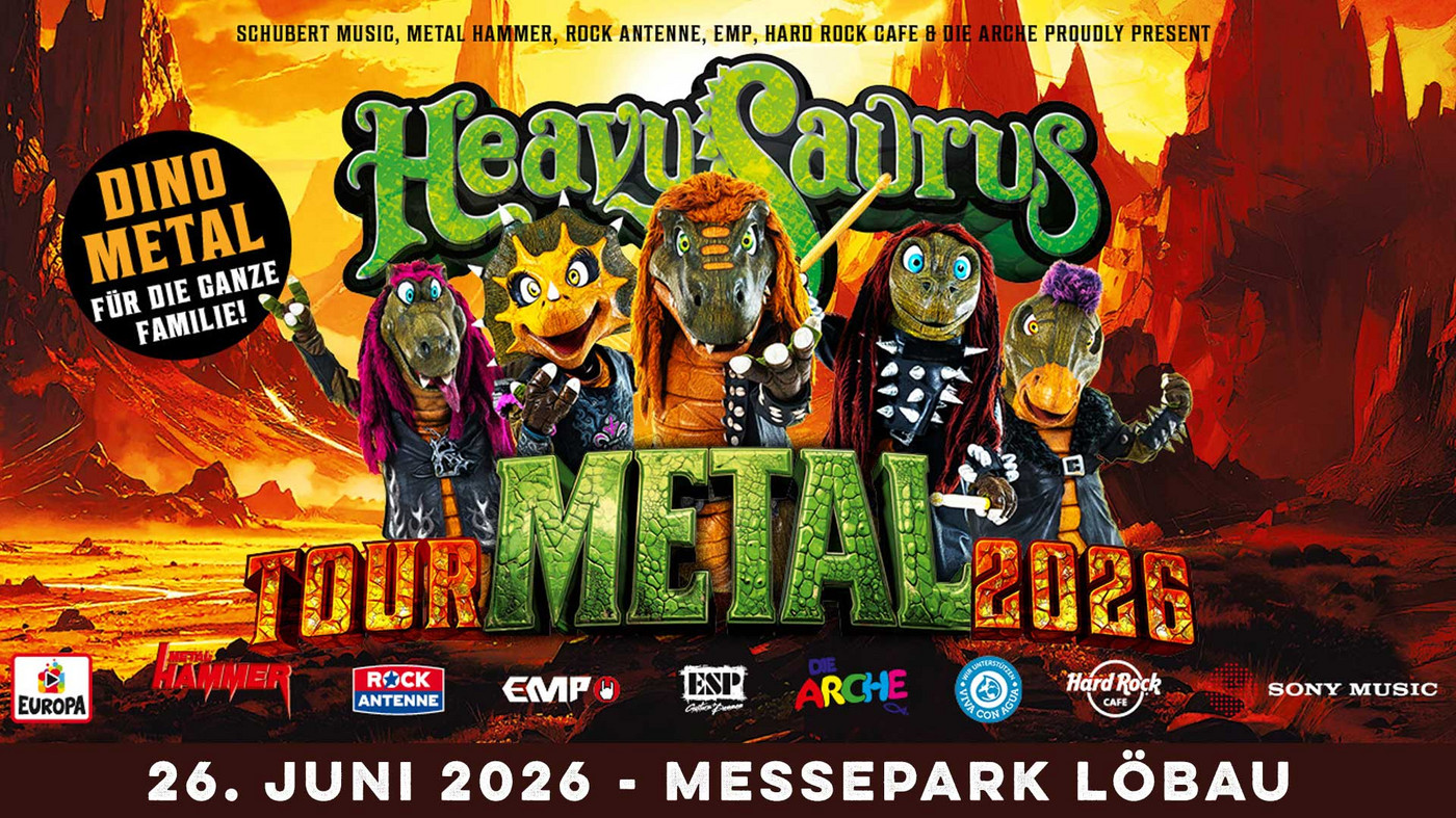 HEAVYSAURUS bringen echten Metal auf die Bühne – für Kinder, Eltern und alle, die Rockmusik lieben! Vier Dinosaurier und ein Drache sorgen mit Gitarrenriffs, Double-Bass-Drums und mitreißenden Melodien für Begeisterung bei Groß und Klein. Am 30.01.2026 erscheint ihr neues Album „METAL“ mit 15 brandneuen Songs, gefolgt von der großen METAL Tour 2026 durch Deutschland, Österreich und die Schweiz. Was als Idee begann, Metal kindgerecht zu machen, ist heute ein Musikphänomen: energiegeladen, liebevoll und mit echtem Live-Sound. Die Shows sind spektakulär – mit Licht, Nebel, Funkenregen, Konfetti und jeder Menge Mitmachspaß. Kinder können ihre Dino-Helden beim Meet & Greet persönlich treffen. Und das Beste: Pro verkauftem Ticket geht 1 Euro an die Kinderhilfsorganisation „Die Arche“. HEAVYSAURUS verbinden Generationen- mit Musik, Herz und Humor. Ein Erlebnis für Familien mit Kindern von 3 bis 11 Jahren, das Rockfans jeden Alters begeistert!